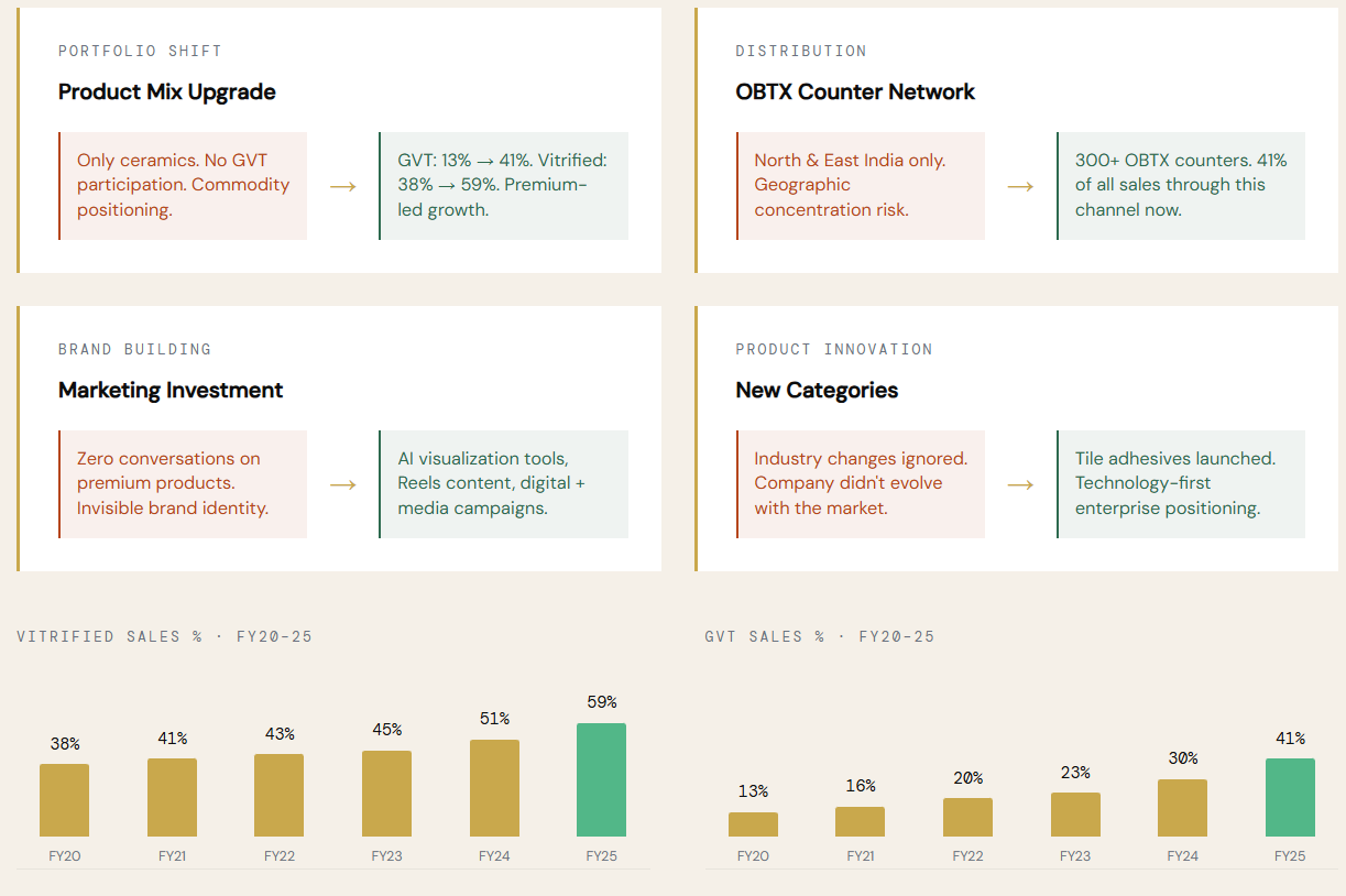 Aditya set out to achieve his mission of bringing great glory to India’s oldest tile manufacturer by focusing on a four pronged strategy: