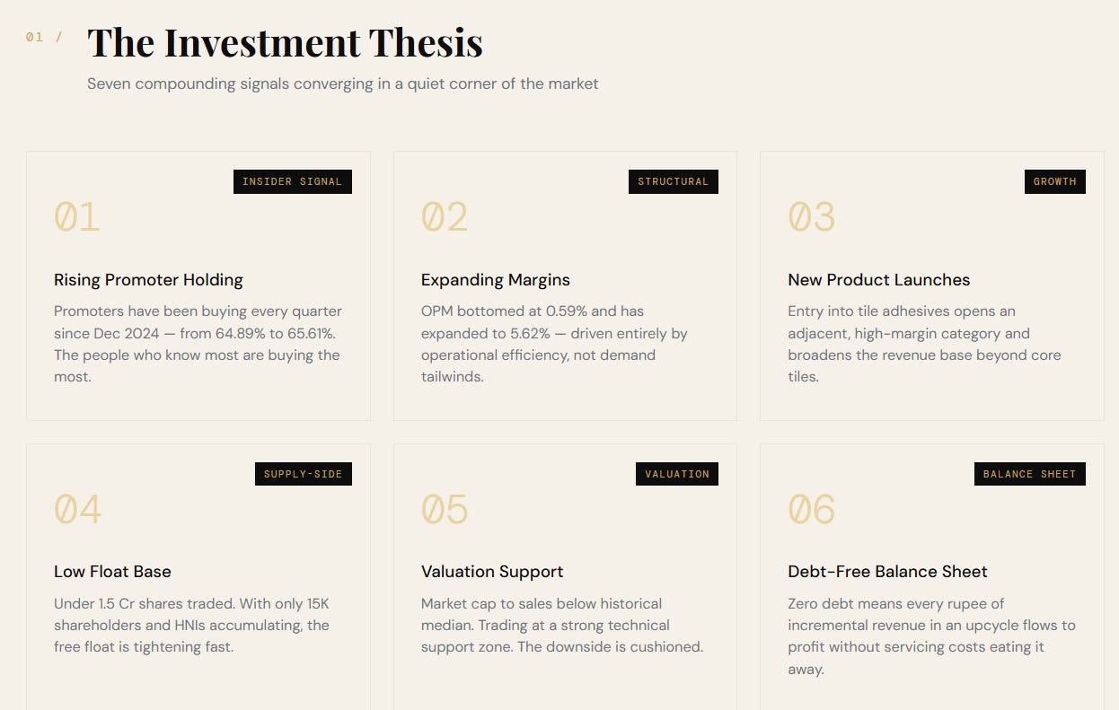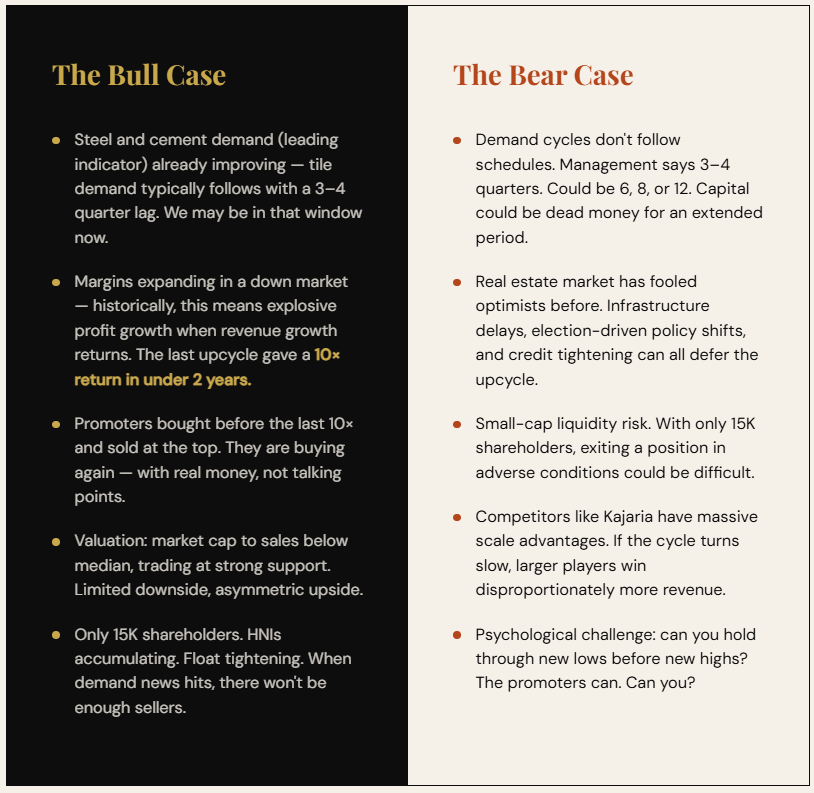 In the Dec 2025 quarter, the company delivered the highest margins of the past 7-8 quarters and the management said they would expect this trend to continue and in fact get better in the coming quarters. Something beautiful is happening in Orient Bell without a demand uptick. Imagine if that lever moves too.