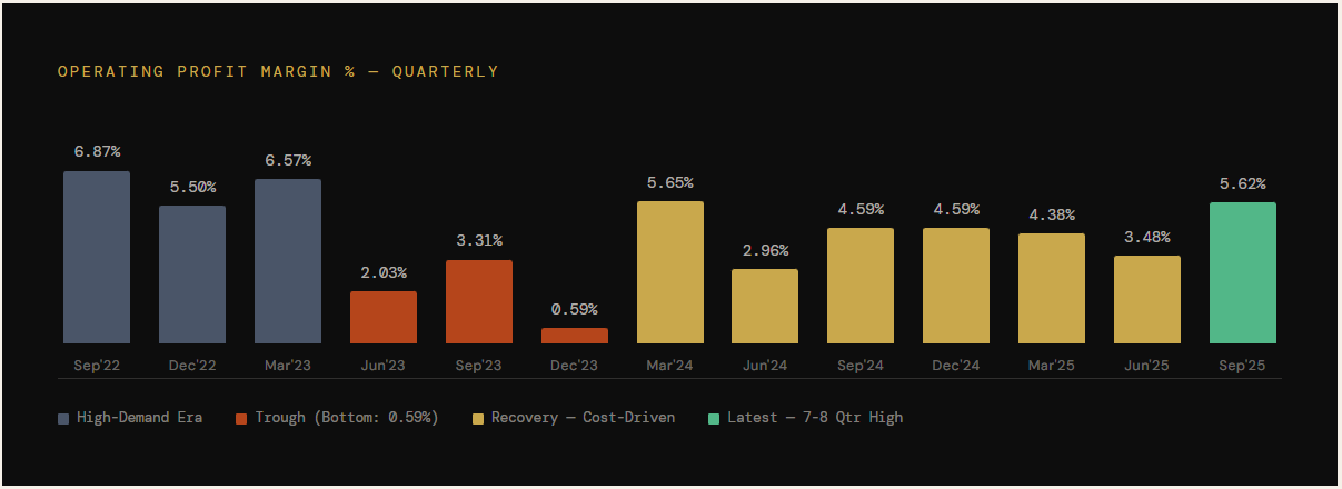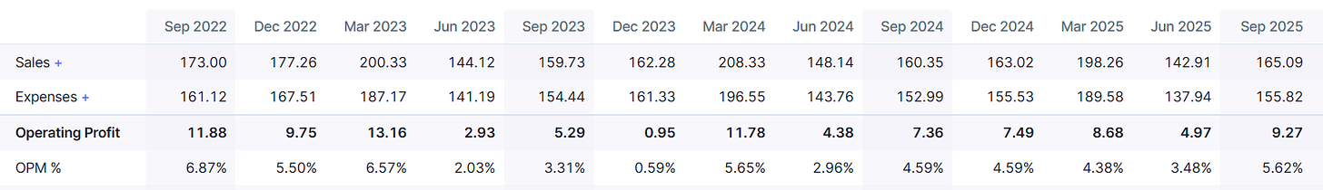 See the gradual increase in margins post Sep 2024? The margins bottomed out around 0.59% to reach here. You’ll look at the Sep 2022 quarter and say this isn’t enough, but I’ll tell you that the Sep 2022 quarter was one of very large demand, demand is subdued right now- the sales in Sep 2025 were lower than Sep 2022, but margins have increased only due to the cost saving exercises done.